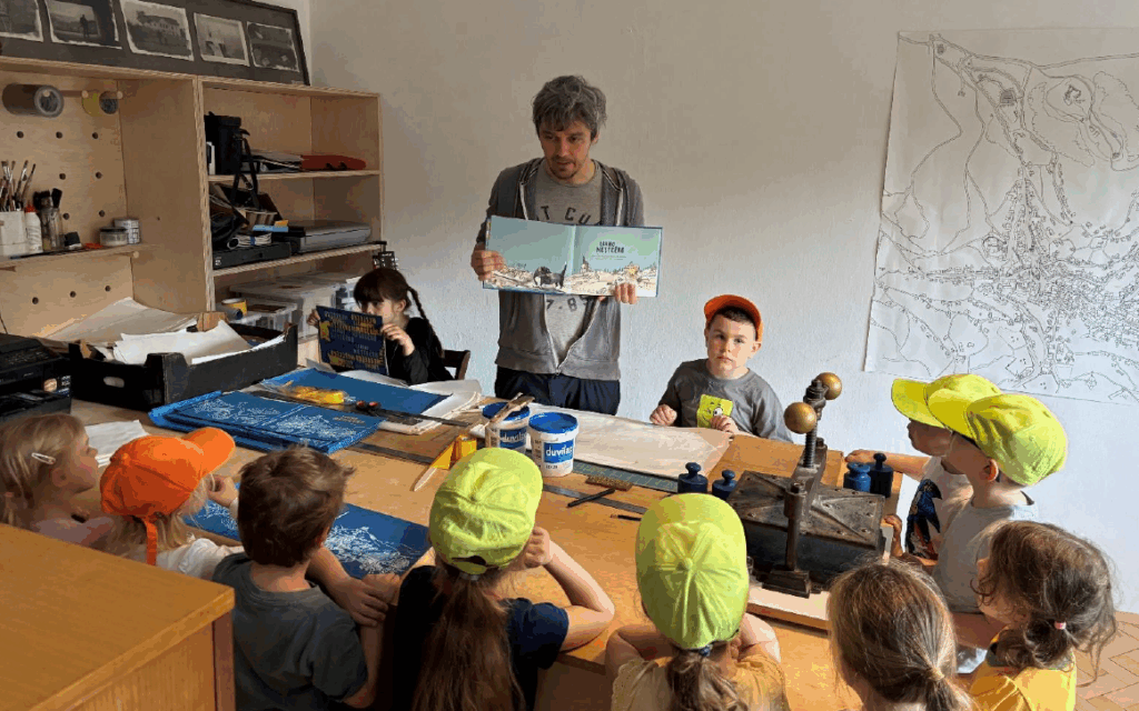 Prvního dne ráno jsme vyjeli směr Banská Štiavnica. Vzhledem k délce cesty byla naplánována zastávka na přírodně cenné lokalitě zvané Partyzánska lúka, která dětem poskytla možnost pohybového uvolnění a zároveň sloužila jako prostor pro environmentální vzdělávání. Děti zde pozorovaly místní flóru, vnímaly charakter krajiny a díky potůčku, který oblastí protéká, měly příležitost seznámit se s principy vodního ekosystému a jeho významem pro život v přírodě. Na tyto poznatky navazovaly výchovně vzdělávací činnosti podporující zvídavost a prožitkové učení. Po příjezdu do Banské Štiavnice a společném obědě následovala návštěva kreativní dílny Arte Misia, zaměřené na tradiční výrobu knih. Děti se aktivně zapojily do procesu výroby šité knihy a osvojily si základní poznatky z oblasti mediální výchovy a polygrafie. Výstupem byla vlastní kniha s názvem „Lakiho městečko“, která vznikla podle příběhů spojených s konkrétními místy ve městě. Každé dítě si tuto knihu odvezlo domů jako osobní památku a výsledek své práce. Tím došlo k propojení poznávání nového prostředí s konkrétním výstupem, který posiloval dětskou motivaci a vztah k četbě.