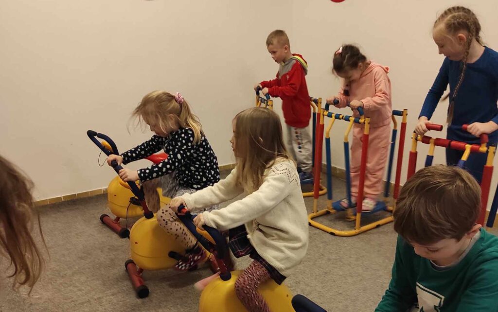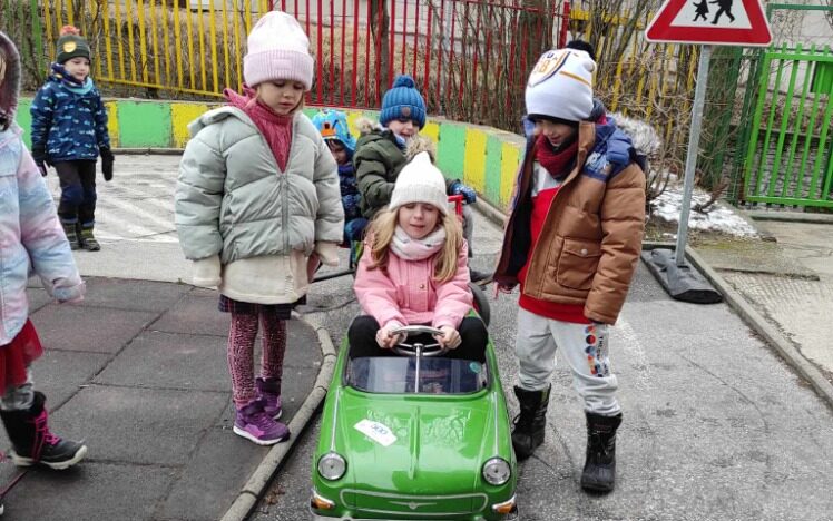 Při pobytu na školní zahradě měly děti k dispozici šlapací auta, koloběžky a tříkolky, se kterými jezdily po dopravním hřišti a upevňovaly si pravidla silničního provozu.